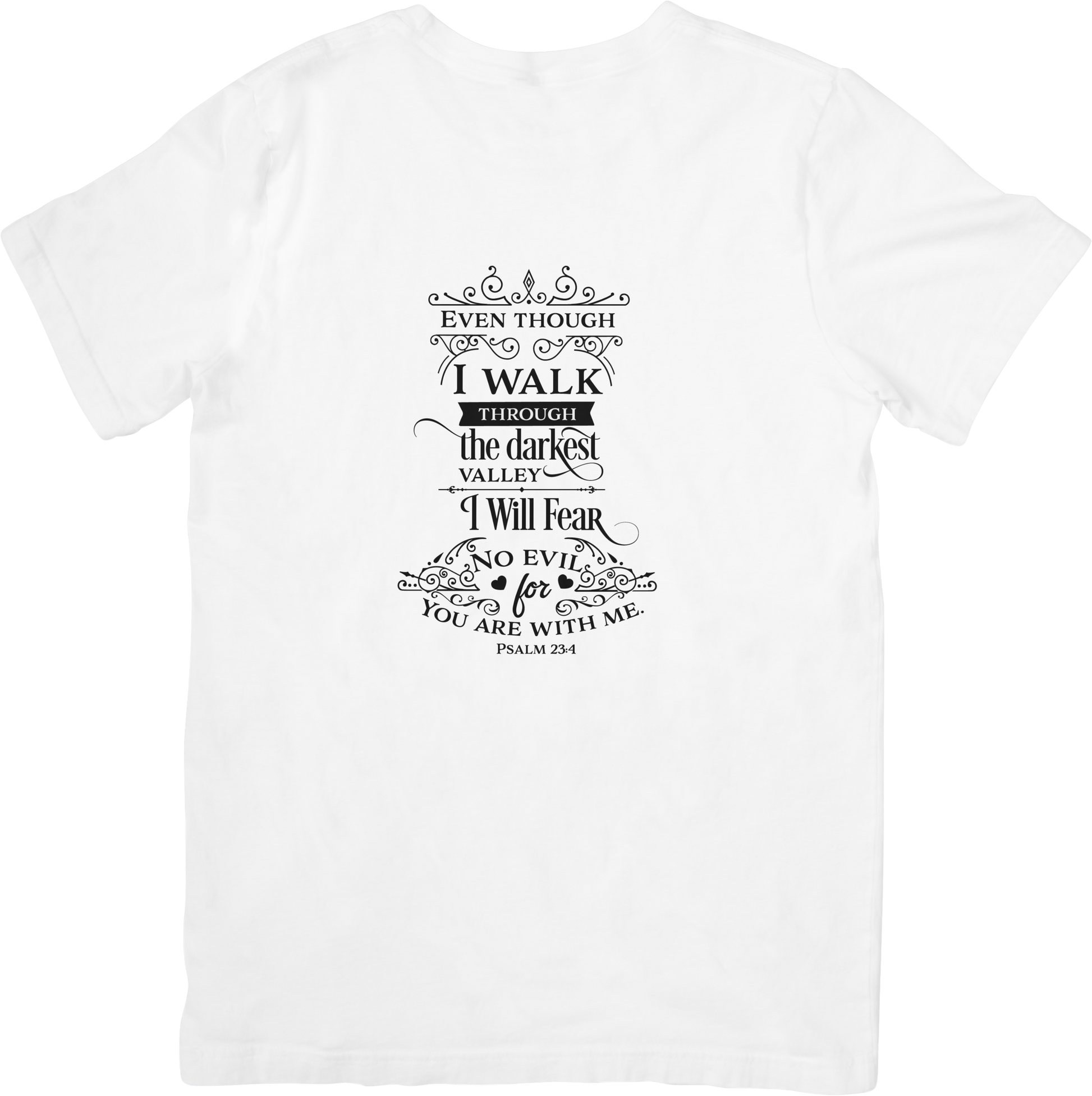 Wear your faith with courage in this elegant “Even Though I Walk Through the Darkest Valley, I Will Fear No Evil – Psalm 23:4” t-shirt. Featuring a beautifully scripted layout with ornate flourishes, this shirt is a powerful reminder of divine protection and strength in the face of adversity.