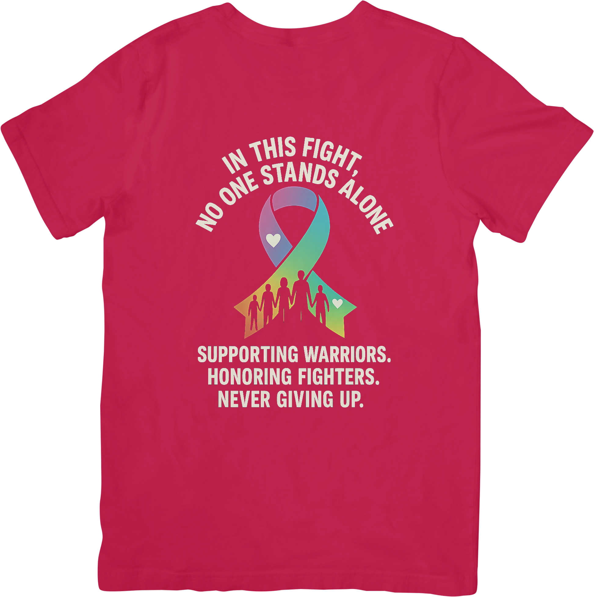 Show your unwavering support for those facing life’s toughest battles with this powerful awareness t-shirt. Featuring a vibrant multi-color ribbon, united silhouettes, and bold text that reads “In This Fight No One Stands Alone – Supporting Warriors. Honoring Fighters. Never Giving Up.” – this shirt is a statement of unity, love, and strength.
